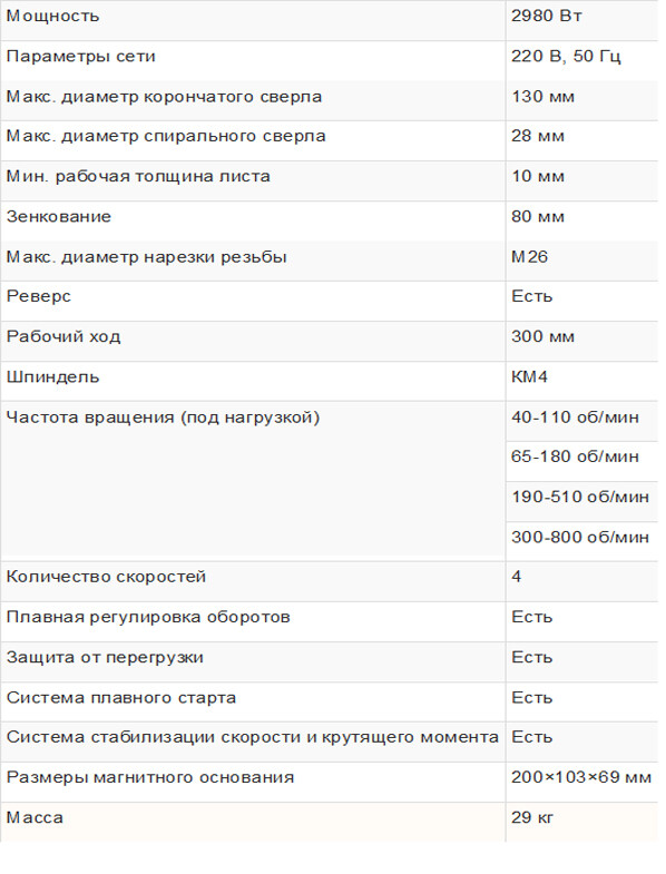 Плавная регулировка скорости. Легкий и мощный станок, предназначенный для монтажных и ремонтных работ. Сверление корончатым сверлом - до 32 мм, спиральным - до 16 мм. Оснащен надежным, прекрасно зарекомендовавшим себя приводом. Замена щеток электродвигателя производится без необходимости его разборки.
