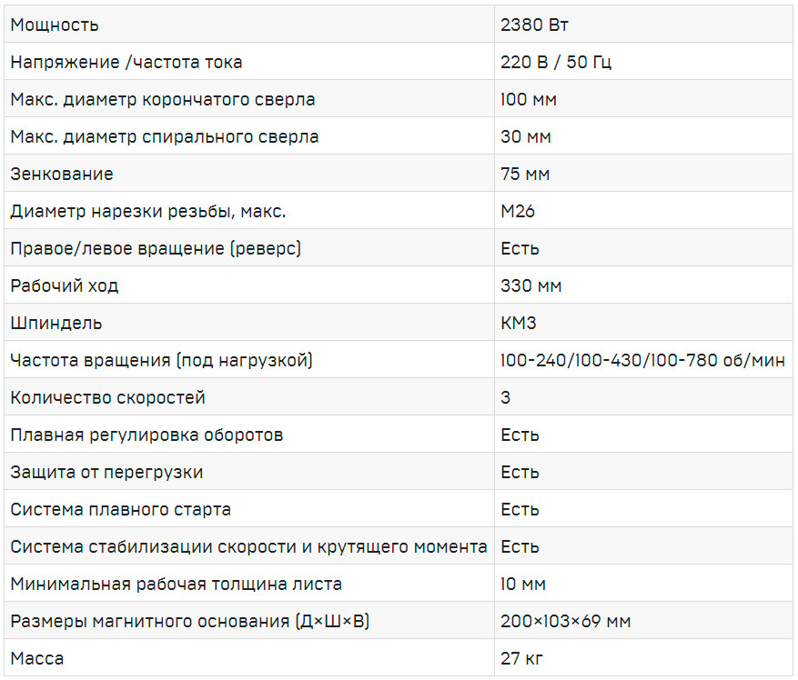Мощный профессиональный промышленный станок, предназначенный для работы на предельных нагрузках. Без труда выполняет отверстия до 100 мм и резьбу до М26.