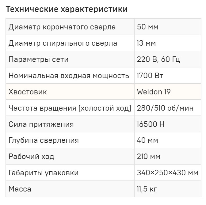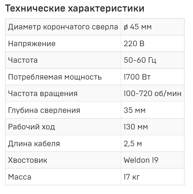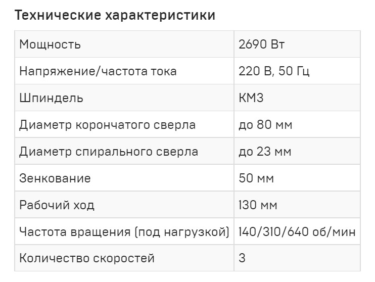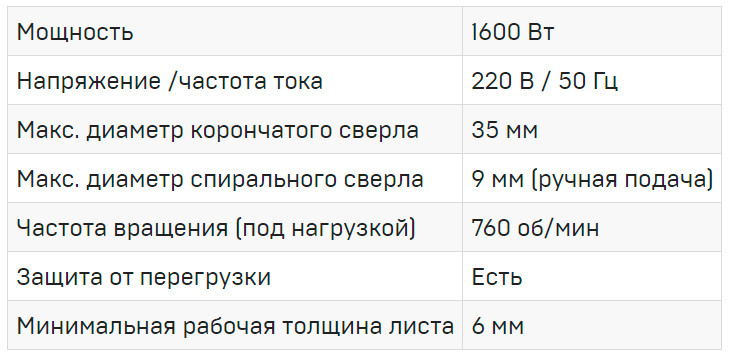 Имеет реверс. 2 скорости. Выполняет отверстия корончатыми сверлами до 50 мм, спиральными до 22 мм.
