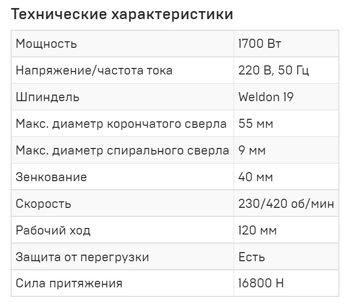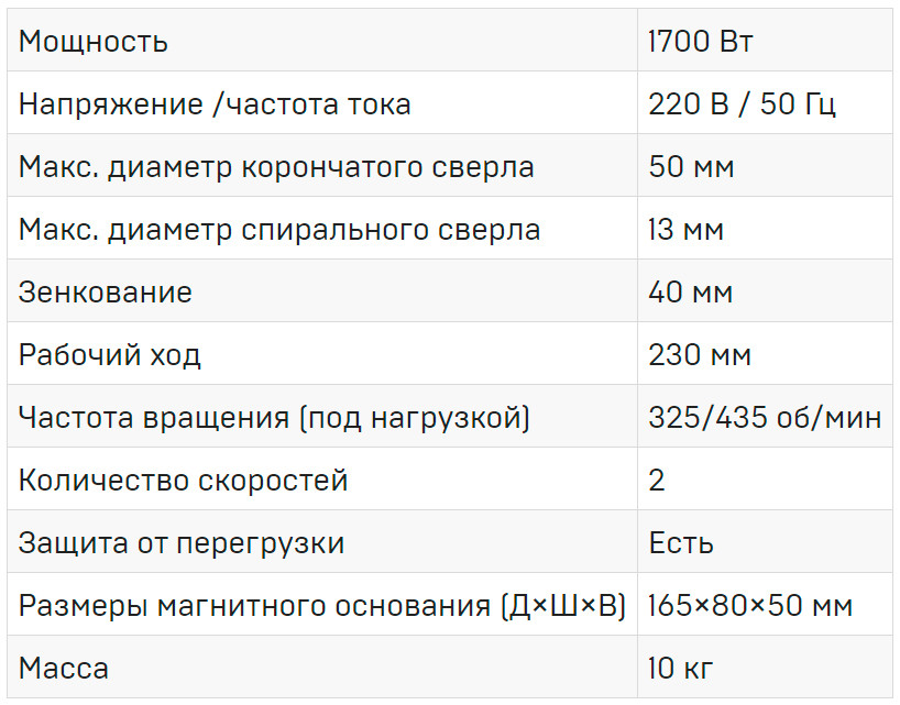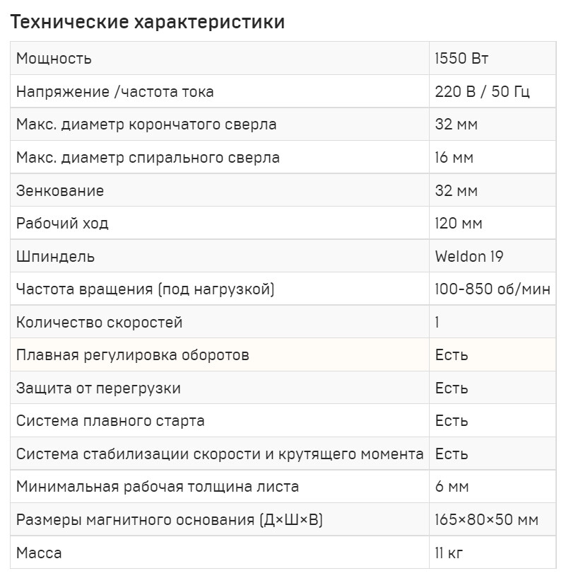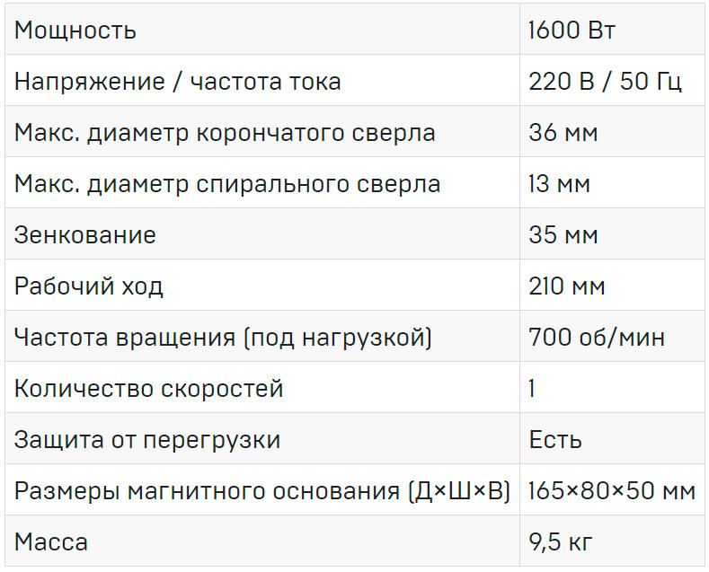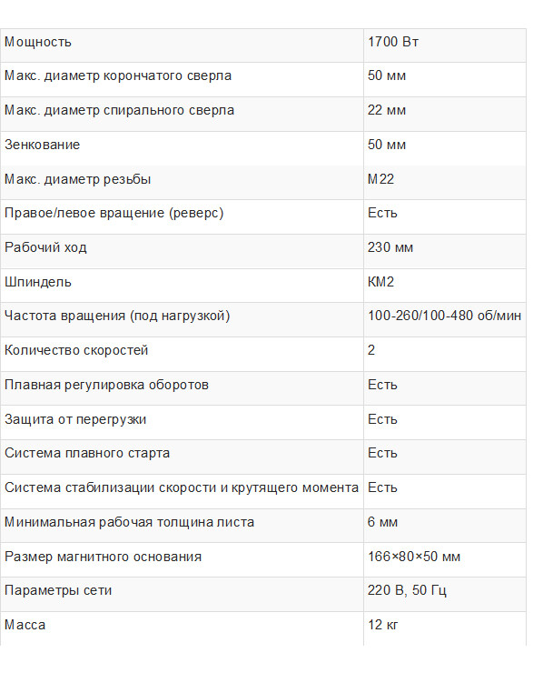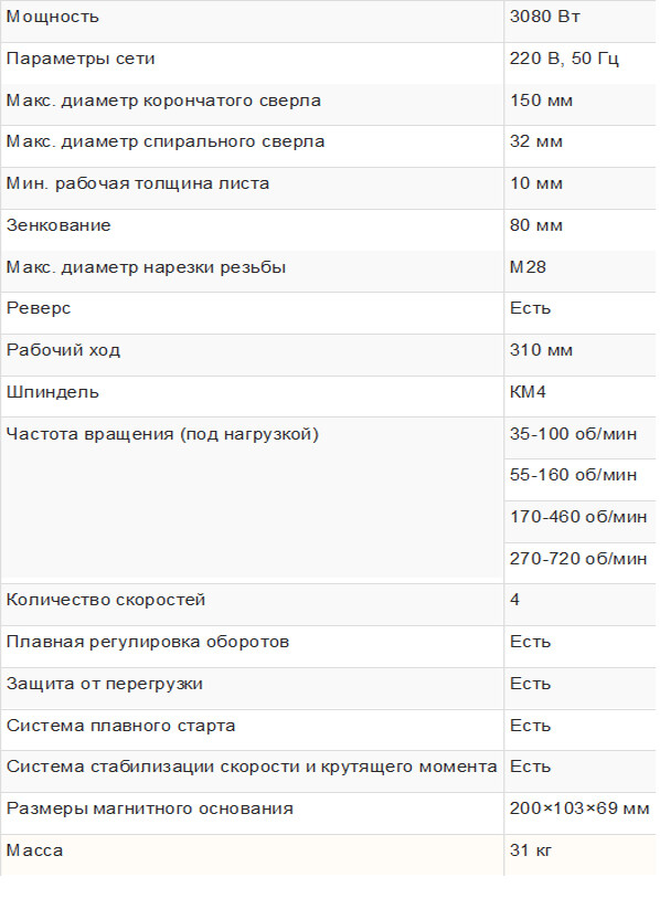 Плавная регулировка скорости. Легкий и мощный станок, предназначенный для монтажных и ремонтных работ. Сверление корончатым сверлом - до 32 мм, спиральным - до 16 мм. Оснащен надежным, прекрасно зарекомендовавшим себя приводом. Замена щеток электродвигателя производится без необходимости его разборки.